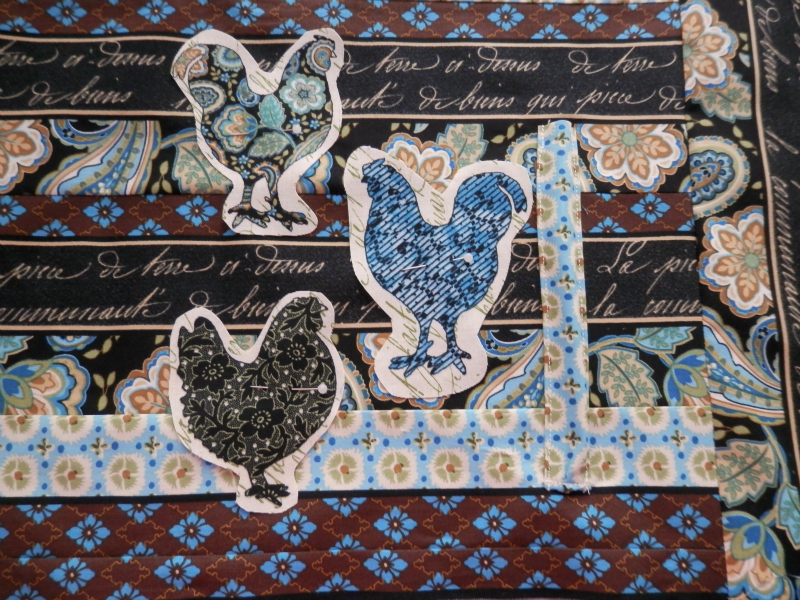 After three email exchanges with Hancock’s of Paducah, they did finally acknowledge that they had sent the wrong item and that their website was incorrect; oh, and they refunded my money for the purchase. But the end result was the same — no French script fabric. Instead, I was stuck with chickens. And god knows, I am too much of a fabric hoarder to ever think about giving it away.