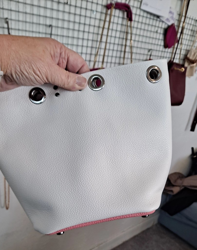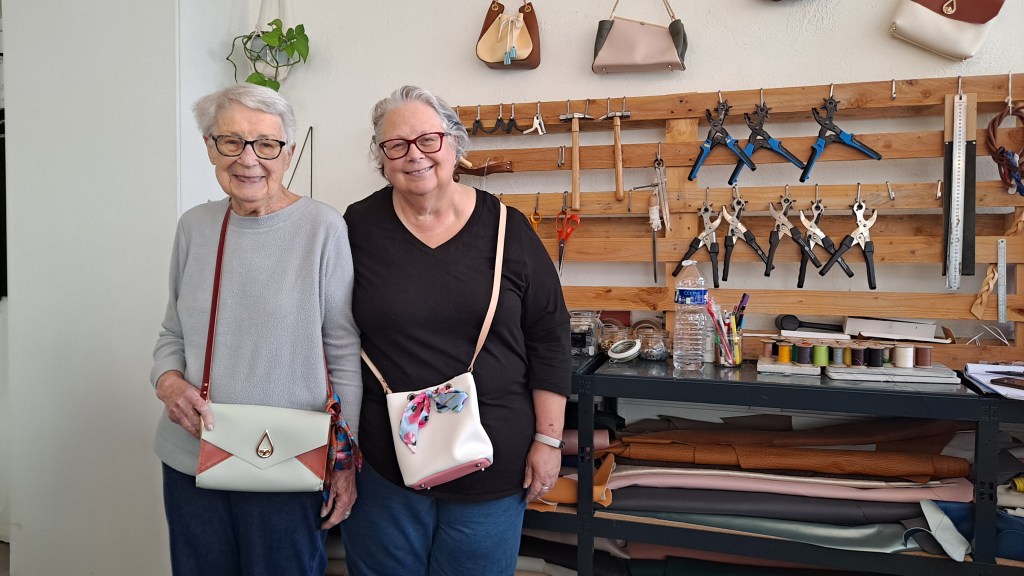 Postscript: Mom decided she wanted a bucket bag, too. Ines helped her select her leather and metal options and assembled the bag for her the following week. She loves both her bags and is looking forward to showing them off to her friends.
