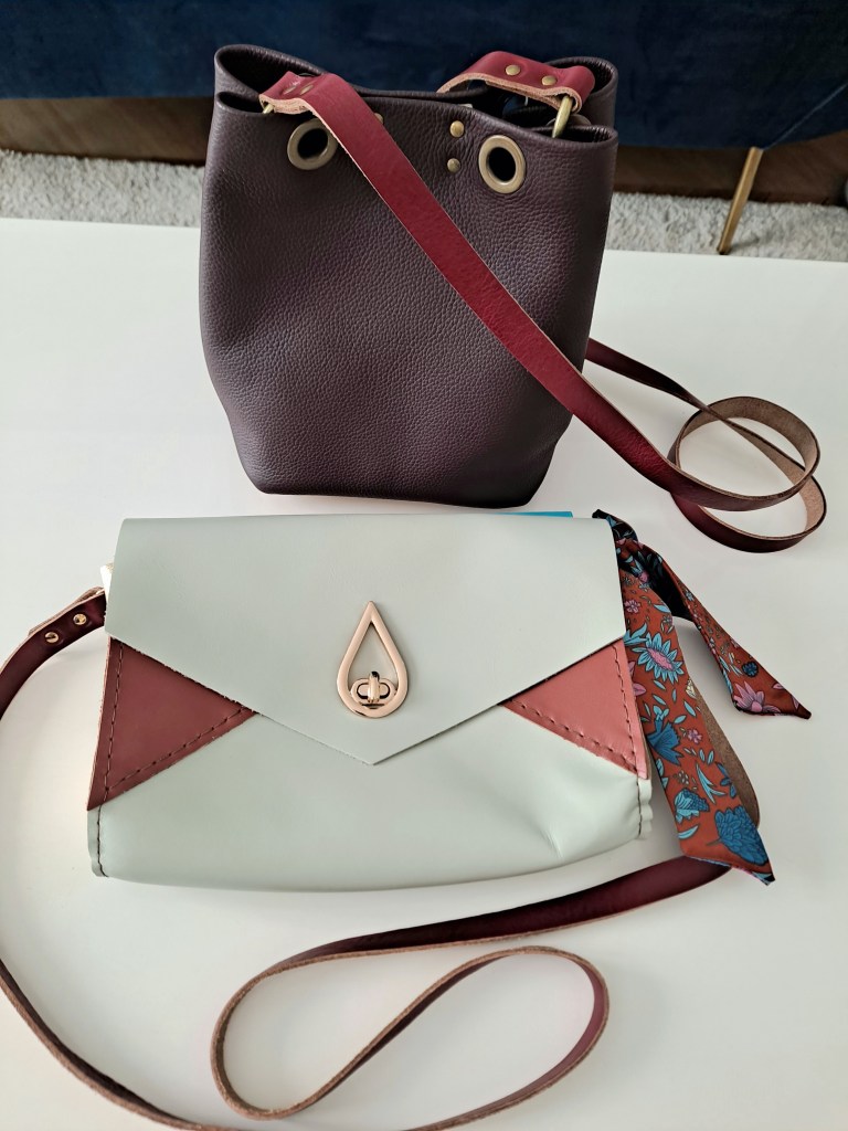 The final step was to add the straps, adjust for length, and add a lovely little accent scarf. Et, Voila! We have custom-made bags!
