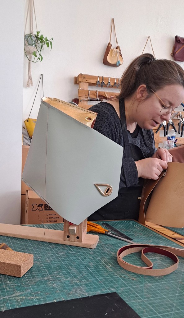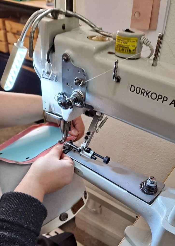 The construction process is fascinating, and gives you a whole new appreciation for the workmanship of a really good leather bag. There is some sanding required to rough up smooth edges to allow the stinky glue to adhere, there is hole punching and hand stitching, a process that requires you to sit with this holder gizmo clenched between your thighs. All a bit awkward, but the two French ladies in the class with us also struggled with great humor. Through it all, Ines handled the four of us with great patience, switching effortlessly between projects and languages.