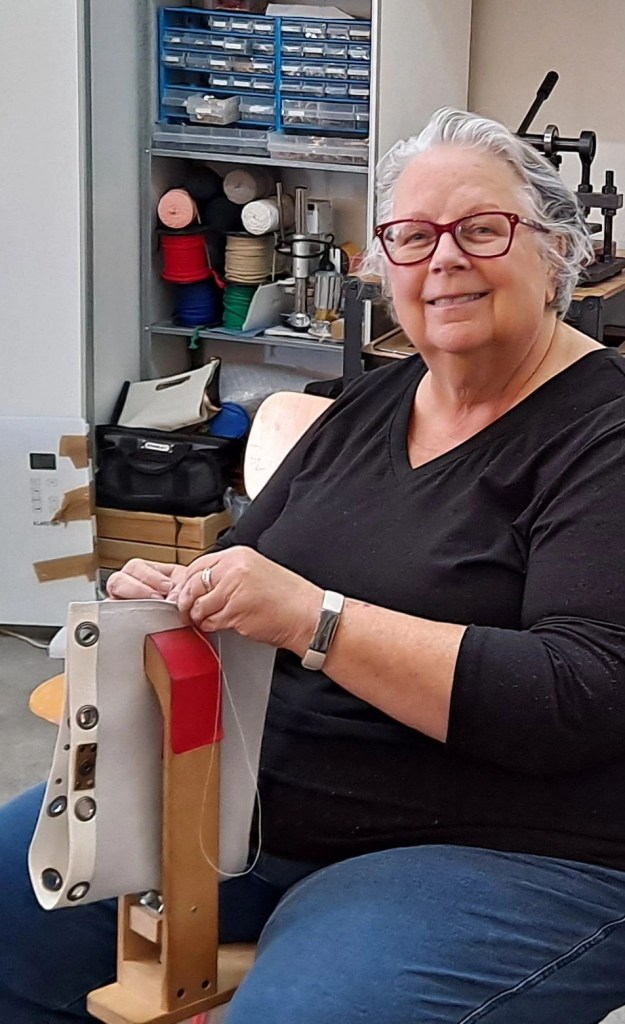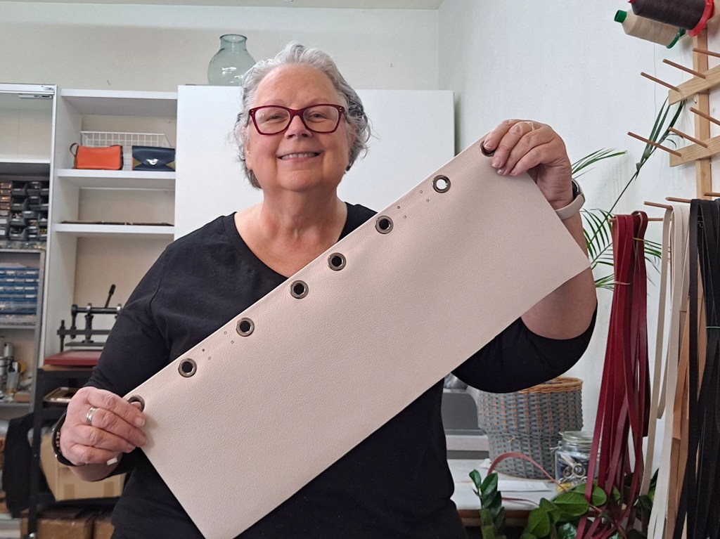 Mom showing off how beautifully her leather choices work with her selected hardware.