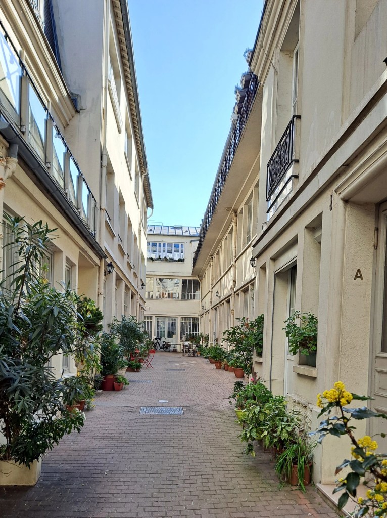 The leather studio is tucked into the back corner of this quiet courtyard off Rue Daguerre in the 14th Arr.