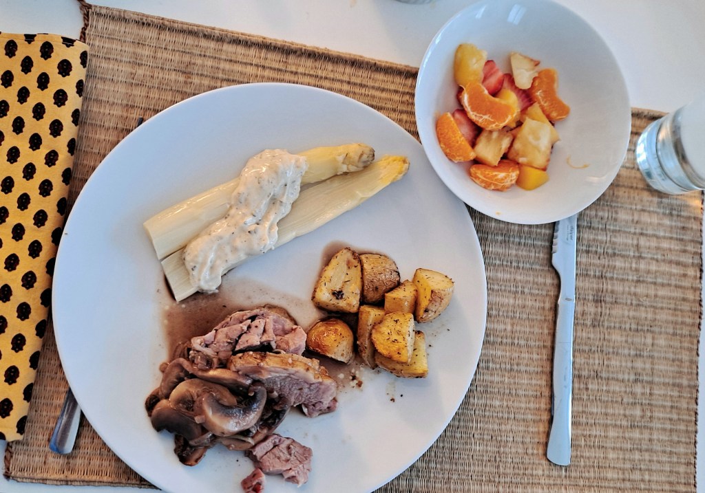 Our Easter feast turned out to be a success. Here’s our main course: Roasted loin of lamb with mushroom and red wine sauce, oven roasted new potatoes, white asparagus with warm Bearnaise sauce and a fresh fruit compote. And all the ingredients came from the Rue Daguerre market shops.