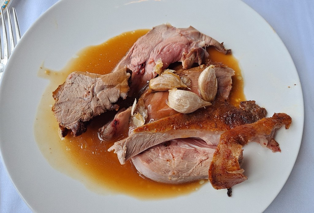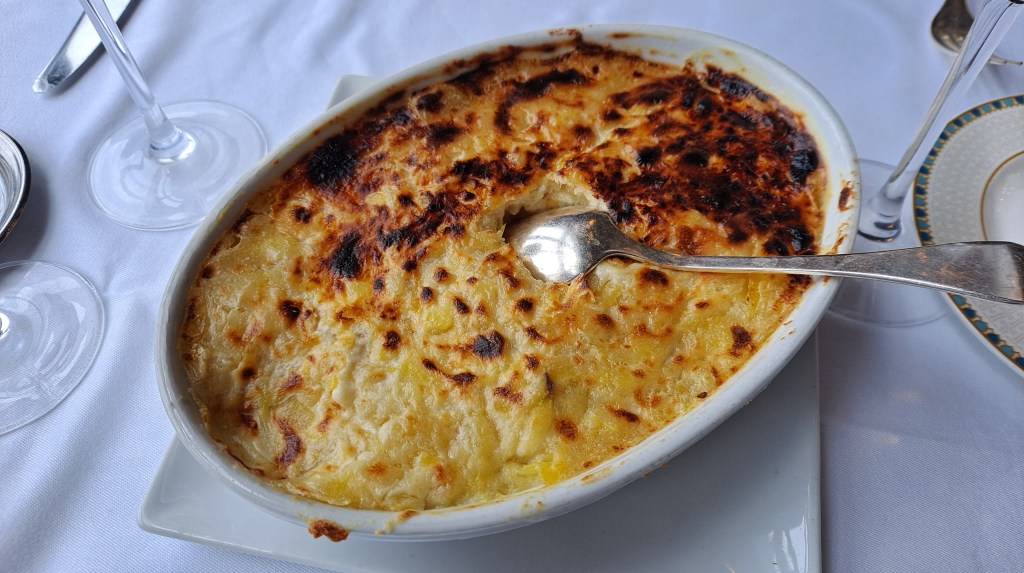 The menu is very upscale French and the house specialty is a leg of lamb, carved table side from a carvery cart and served with a potato gratin casserole. Mike and I had that.