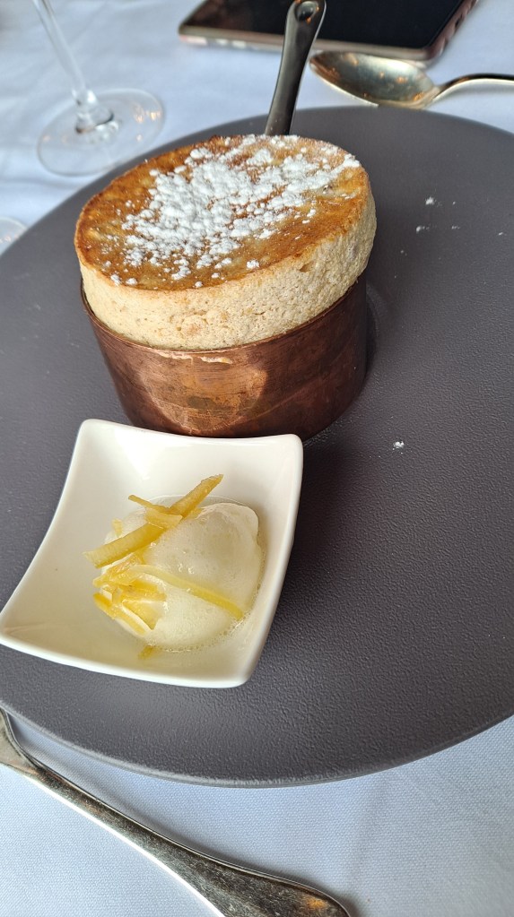 When it came time for dessert, mom had already ordered the hazelnut soufflé with lemon ice cream…because if you are going to have a soufflé, what better place than to have it in Paris???
