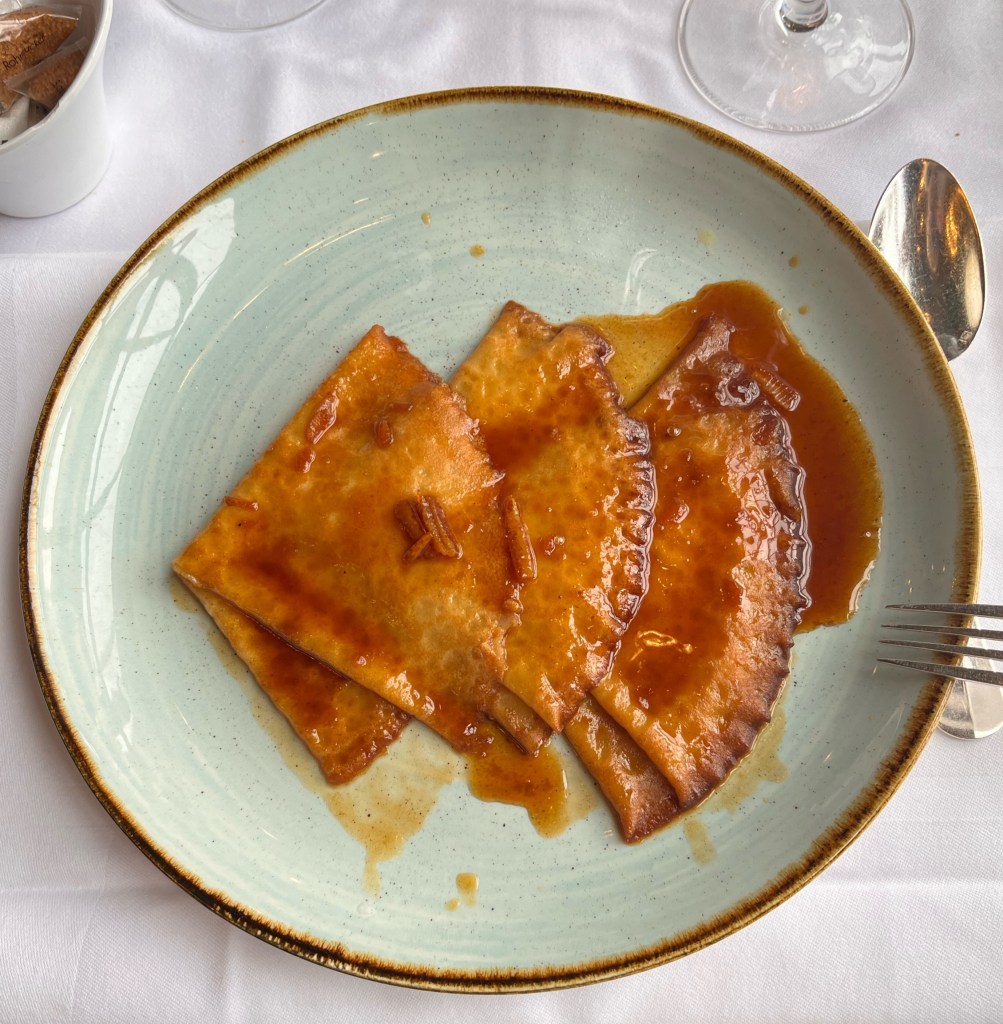 Mike, Nino and I opted for the other house specialty — Crepes Suzette, prepared table side. And the server the other staff referred to as “Monsieur Suzette” really put on a show for us.