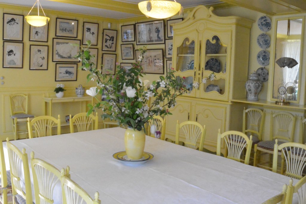 The house is relatively small compared to the garden. Bright, bold colors in the dining room and kitchen show the artist’s love of color, and the decor has a definite Asian flair.
